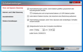 Scans in gepackten DateienJe nach Einstellung durchsucht Trend Micro Titanium AntiVirus Plus auch ZIP-Dateien und bereinigt, löscht oder blockiert bei einem Fund die infizierte Datei. Auf Wunsch fordert Trend Micro Titanium AntiVirus Plus vor Änderungen an Systemdateien den Anwender zur Bestätigung auf. Mit einem Planer legt man automatische Suchläufe und Aktualisierungen auf bestimmte Termine.